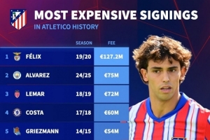 体育资讯11月12日讯 阿波罗体育资本斥资13亿欧元收购马竞俱乐部55%股份,并承诺未来几年再投资约13亿欧元,德国转会市场统计了马竞队史引援的费用,并列出最贵引援排名。